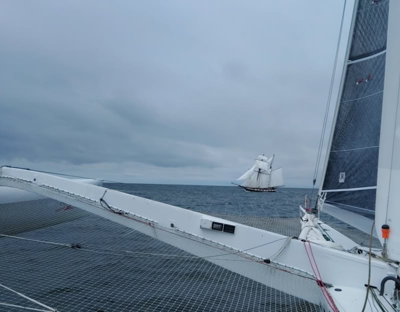 Formidable journée avec une météo idéale, cette sortie avait été reportée faute de vent et heureusement car il serait vraiment dommage de ne pas profiter de la puissance du bateau dans une pétole.  On a aussi profiter du départ de courses d’Ultim et Océan Fifty. Génial.  Alain et son équipage sont vraiment abordables et très sympathiques.  Naviguer en trimaran sur une coque n’est plus un mythe ! O. Loof, 27 septembre 2025